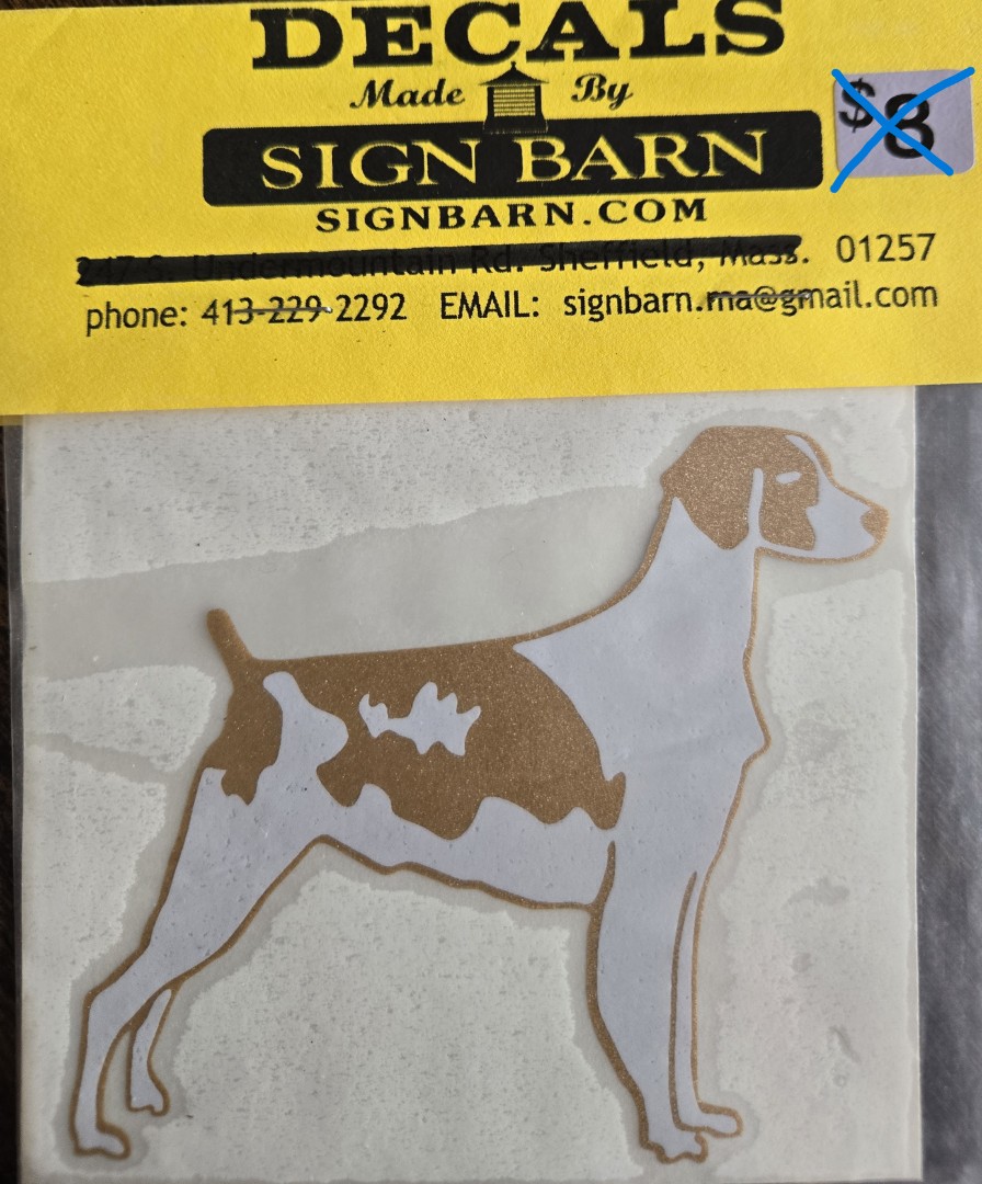 click image to enlarge Product Information This beautiful Brittany decal measures 3.5"x4" and is done in white and glitter gold. The sale price is for right facing decals. Quantities are limited. Purchase Price: $6.95 Qty: Add to Cart