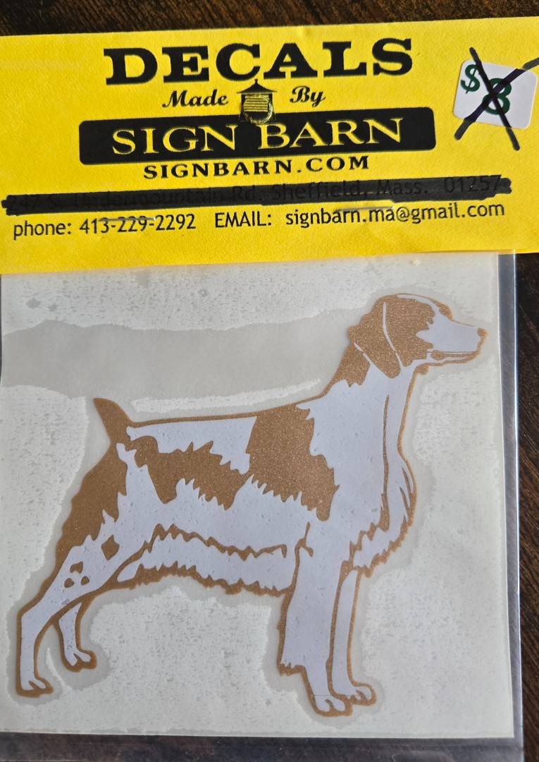 click image to enlarge Product Information This beautiful Brittany decal sparkles in glitter gold. The sale price is for right facing decals that measure 3.5"x4". Quantities are limited. Purchase Price: $6.95 Qty: Add to Cart