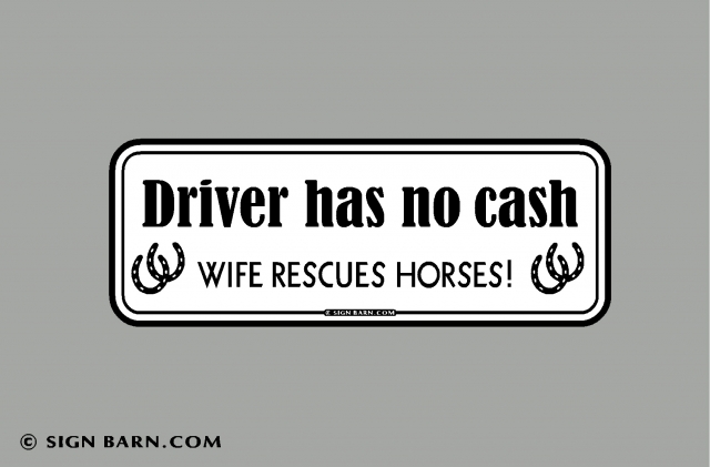 click image to enlarge Driver has no cash wife rescues horses! Product Information Driver has no cash...Wife rescues horses! For all of you hubbies who emotionally and financially help your wife with her passion, this decal or magnet is for you! It measures 3"x8". Available Options 3"x8" decal or magnet, B/W: decal magnet (+$4.00) Background colors for 3x8: black on white glitter gold background (+$3.00)glitter pink background (+$3.00)glitter red background (+$3.00)glitter silver background (+$3.00) Purchase Price: $8.95 Qty: Add to Cart