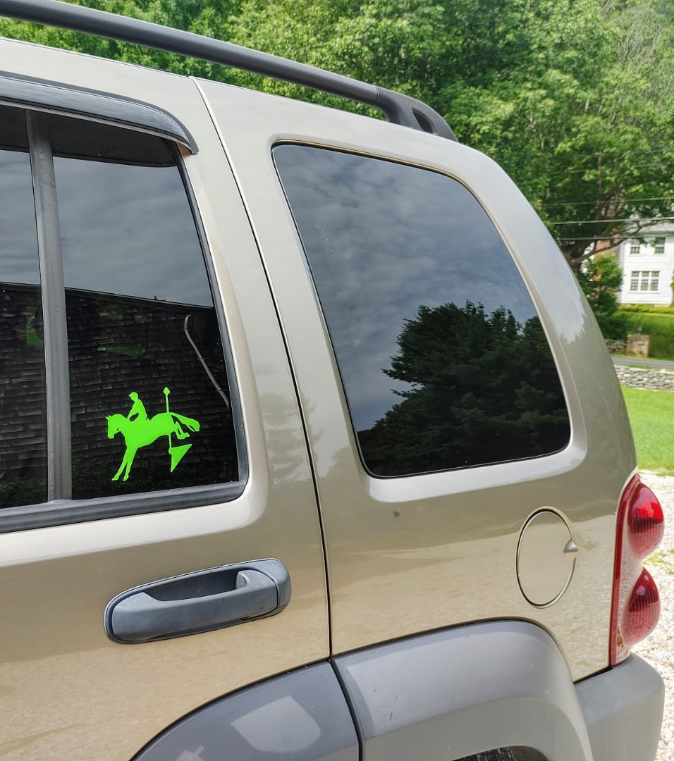 click image to enlarge Product Information This lime green eventing horse measures 5" wide and is applied to the outside of this Jeep's stationary window. Additional sizes and colors are offered below. Available Options Eventing Horse Decal Size: 5" wide 6 (+$2.00)8 (+$4.00)10 (+$7.00)12 (+$10.00) decal color: beige black copper dark brown gold lime green pink purple red silver sky blue teal white mustard direction: facing left facing right Purchase Price: $7.95 Qty: Add to Cart