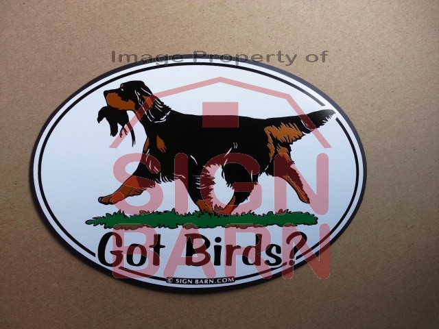 click image to enlarge Gordon Setter Got Birds? Product Information Gordon Setter, Got Birds?This funny 5"x7" decal or magnet (choose below) is sure to put a smile on your face! Available Options 5x7 oval decal or car magnet: 5x7 decal 5x7 magnet (+$4.00) Purchase Price: $11.00 Qty: Add to Cart