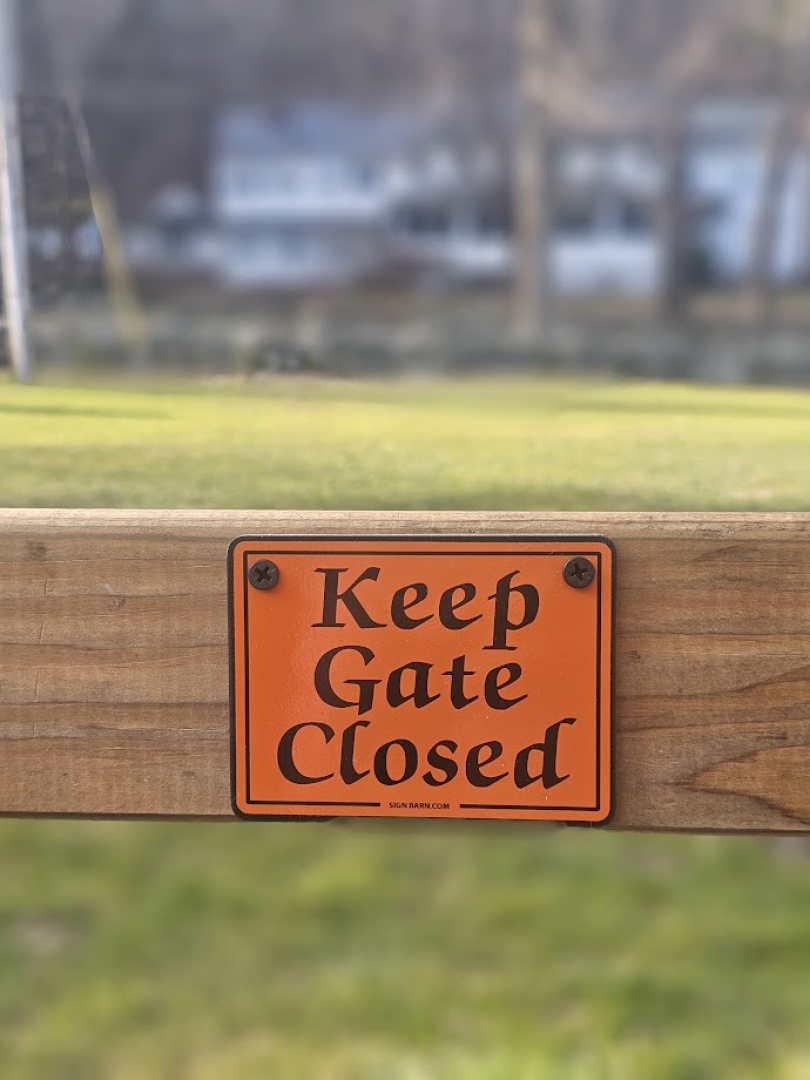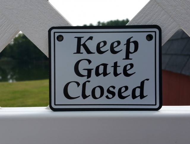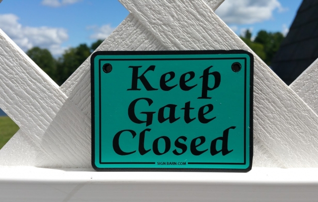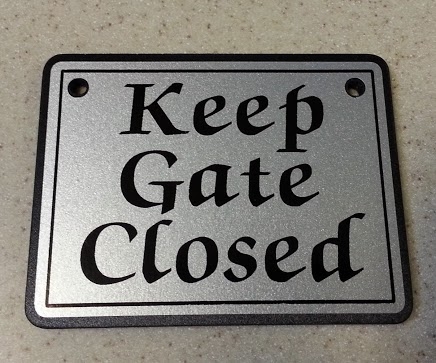click image to enlarge Keep Gate Closed show in silver Product Information Keep Gate Closed 3"x4" This small and effective sign offers the gentle reminder to Keep Gate Closed. Made of solid PVC, it is meant to weather the elements with little maintenance other that a gentle wiping periodically to remove surface dust. Available Options background color options for 3x4 signs or decals: butter yellow lavender light blue lime green orange pink red sandstone metallic silver white metallic gold wedgewood blue PVC Sign Mounting Hardware: Pair of Black Cable Ties Pair of Screws Purchase Price: $12.95 Qty: Add to Cart