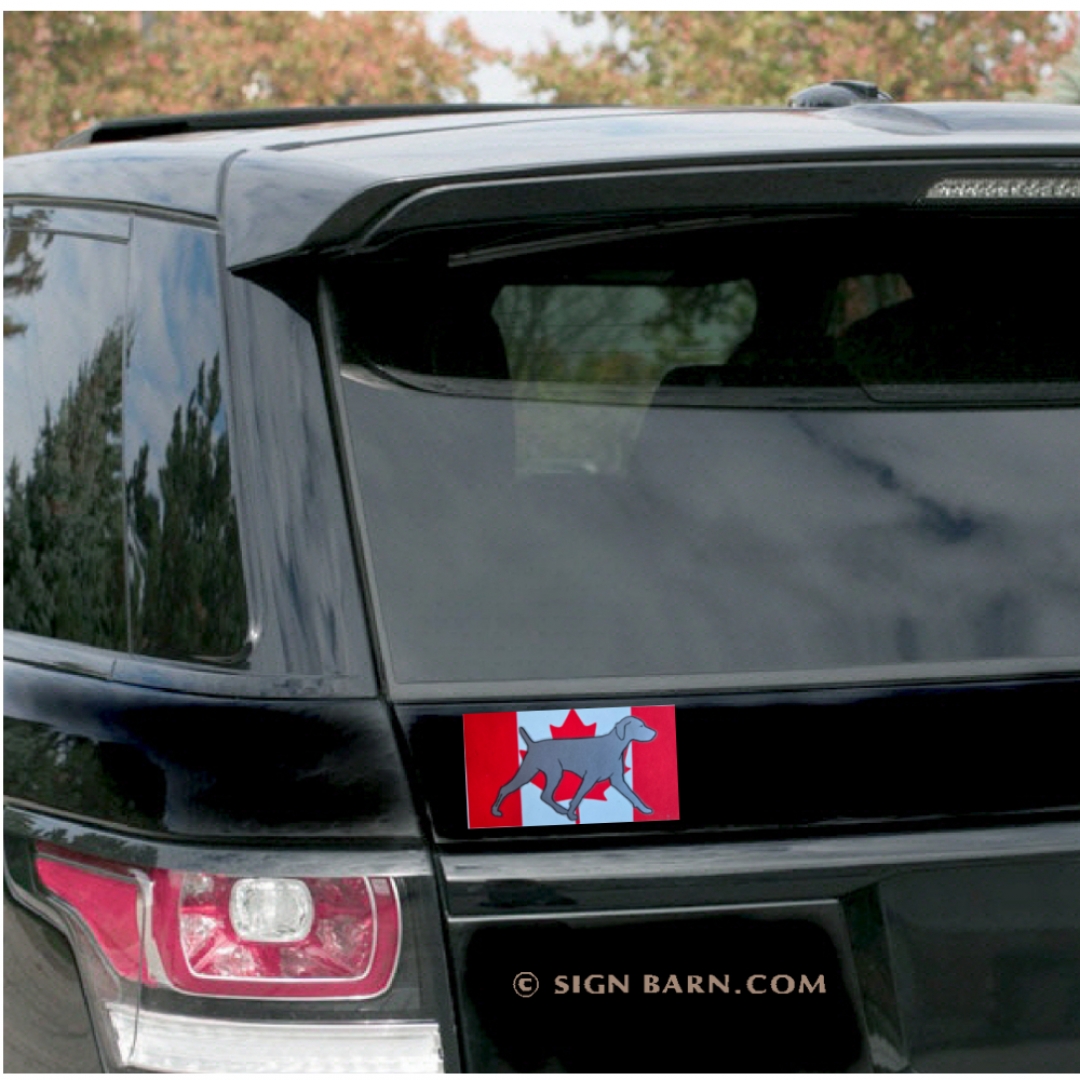 click image to enlarge Product Information This 3"x6" outdoor decal features our gaiting Weimaraner over a Canadian flag. Apply this decal to any smooth, hard surface, including the outside of a window. Available Options direction: facing left facing right Purchase Price: $10.95 Qty: Add to Cart